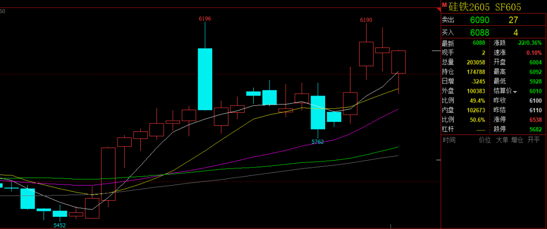今日硅铁期货主力合约 SF2605 探底回升,盘面先抑后扬。开盘小幅走弱至5928点后获得支撑,随后震荡反弹,最高涨至6092点,尾盘收于6088点,日K线收出带长下影线的大阳线,显示下方承接意愿较强。今日成交量20.3万 手,较昨日减少8.2万手,持仓量17.5万手,较昨日微减3245手,仓单增加150张至10352张。市场交投情绪谨慎,多空分歧仍在,短期或以区间震荡修复为主。技术指标看,MACD红柱继续走扩,DIFF与DEA维持向上发散,多头动能仍在累积;KDJ三值虽高位钝化但未现死叉,短期仍有上冲动能;均线系统继续向上,短期呈现多头排列迹象。总体来看,硅铁市场技术面修复迹象明显,但量能配合不足,后续仍需关注宏观情绪及需求端变化。预计短期以震荡整理为主,关注6100点附近压力及6000点整数关口支撑(仅代表我方观点,不做投资建议,市场有风险,投资需谨慎)。